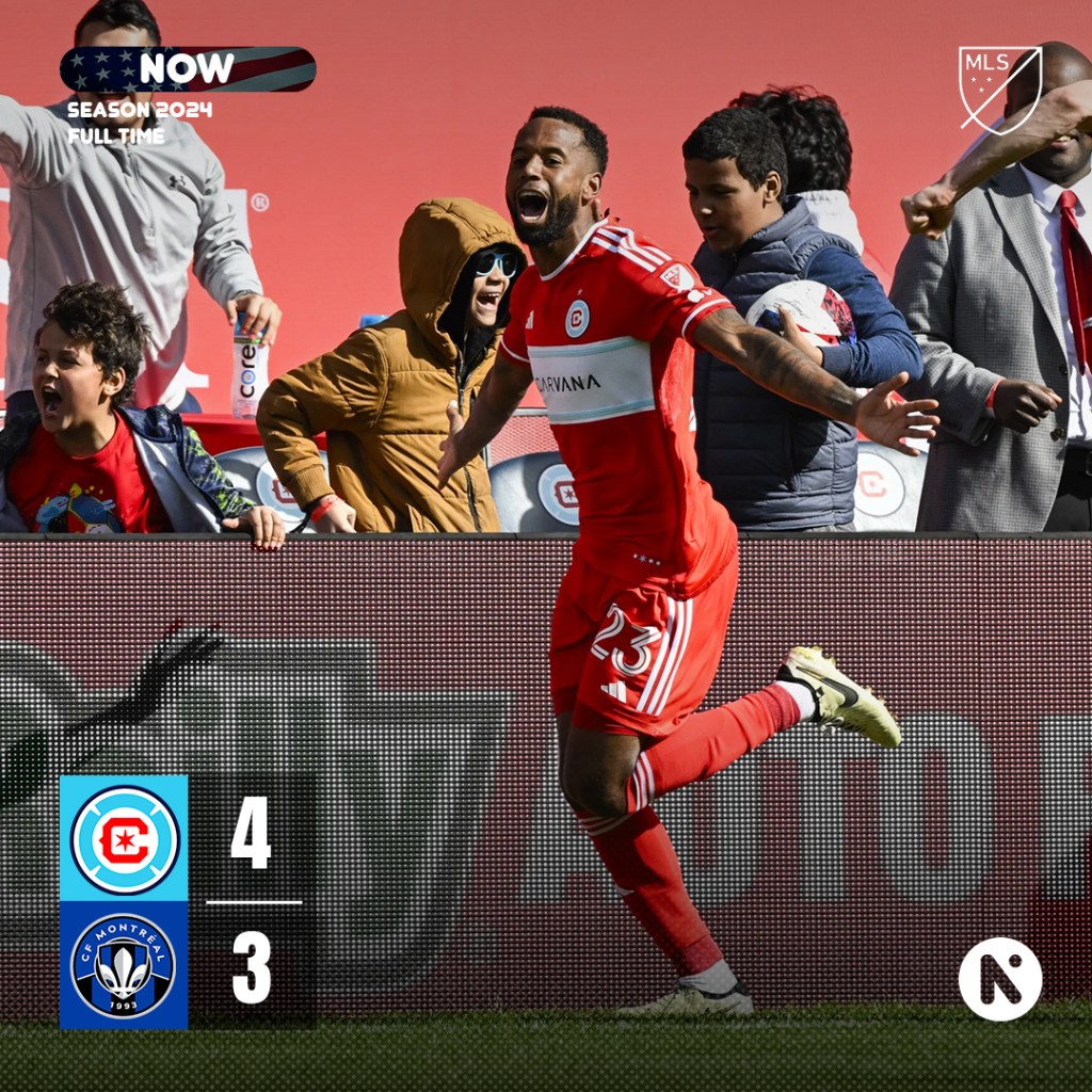 Kellyn Acosta scored from beyond midfield at the 99th minute on a misplayed ball by the keeper and Chicago Fire FC completed a stunning 4-3 comeback win over CF Montreal for its first win of the season on Saturday.